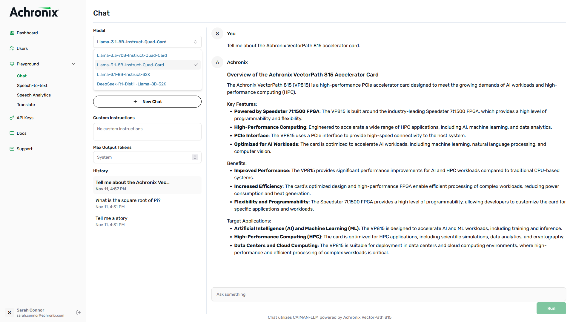Achronix AI Console is an FPGA-powered evaluation platform for high-performance AI inference on VectorPath 815 cards, featuring real-time Speech-to-Text and open-source LLM acceleration for rapid benchmarking and deployment.